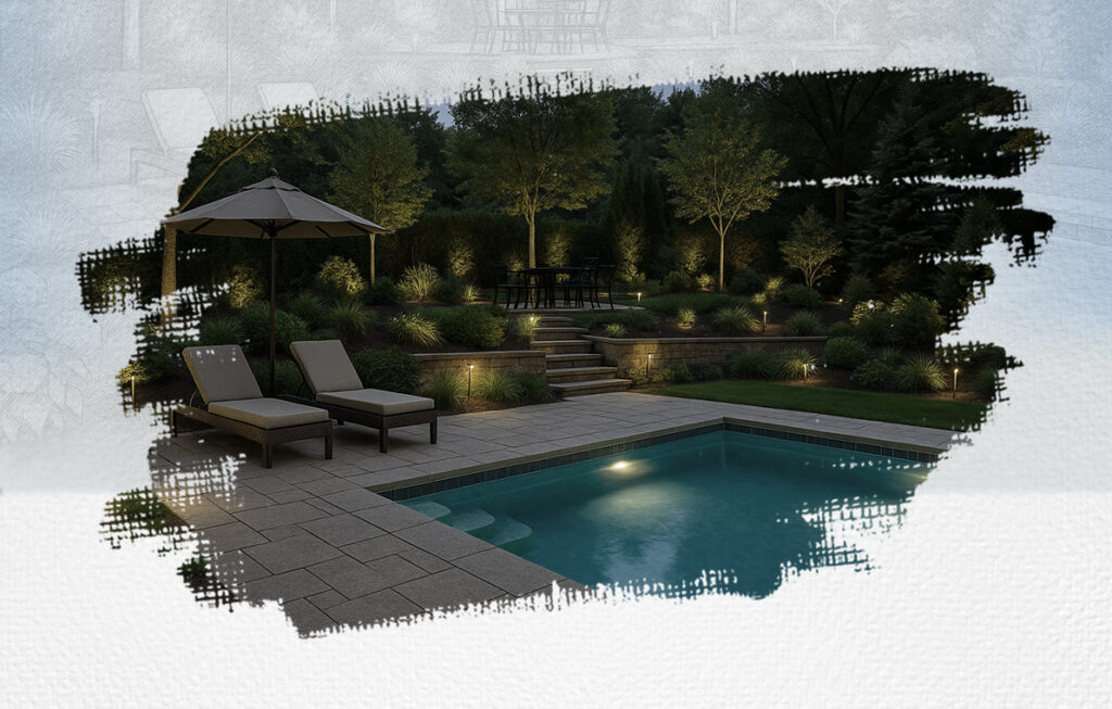 Hardscapes, softscapes, pools, and lighting in harmony with architecture.